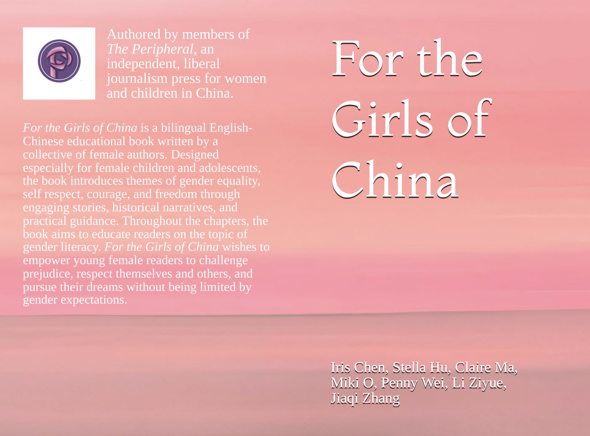 Co-authored by several staff members, For the Girls of China is a seven-chapter bilingual children’s book educating young girls in China on gender literacy. It is available on Amazon.